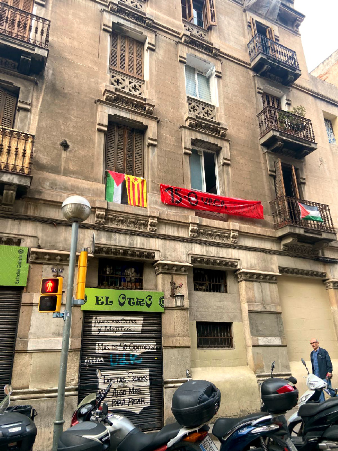 J’étais dans le Barri Gòtic, l’ancien quartier historique de Barcelone où se côtoient, en bas sol, la minuscule synagogue la plus ancienne d’Europe et, jusqu’au ciel, l’altière cathédrale qui avait opprimé les miens lors de l’Inquisition, marchant chaque jour dans les rues étroites où alternent sur les murs magasins de touristes regorgeant de vulgarités inutiles, affiches anti‐sionistes et tags « Fuck Israel » ou « Death to the IDF », tandis que de nombreuses fenêtres déroulaient fièrement, où que je lève les yeux, le drapeau palestinien, plus présent dans les rues de la ville que les drapeaux espagnols ou catalans.